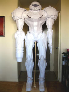 Ich scheue davor zurück, dies Papiermodellbau zu nennen, denn das ist ein Wort, das man normalerweise mit kleinen Dingen assoziiert, die auf Tischen stehen und liegen. Stattdessen werde ich dieses knapp 2 Meter 10 Zentimeter hohe Modell von Metroids Samus Aran als Meisterwerk bezeichnen.